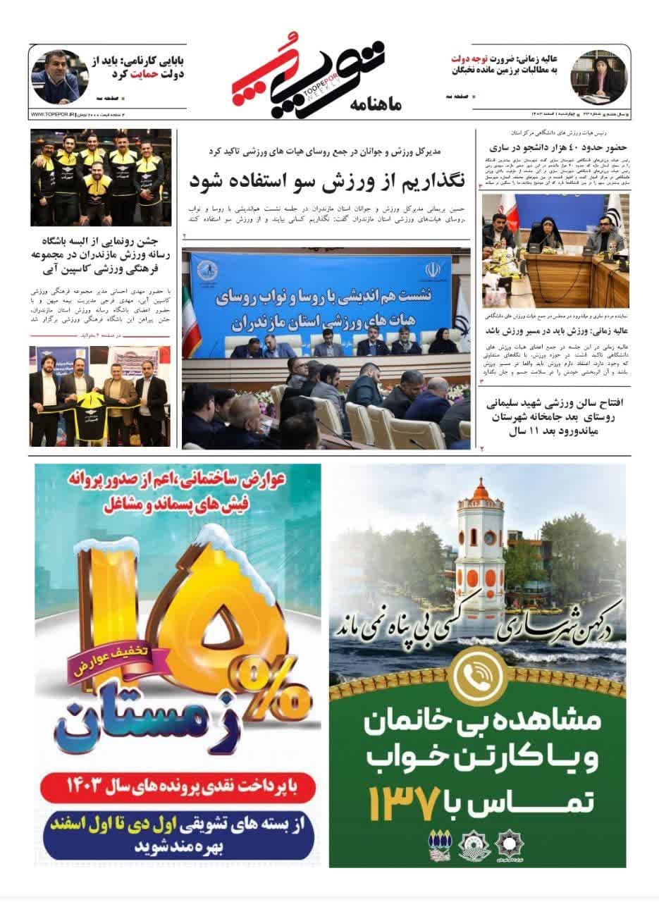 شماره جدید ماهنامه توپپُر در اسفند ماه ۱۴۰۳ به صورت الکترونیکی از این رسانه در دسترس عموم قرار دارد. در این شماره در خصوص موضوعات مختلف ورزشی و اجتماعی و فرهنگی و توجه ویژخ به و ورزش مازندران مطالبی منتشر شد.